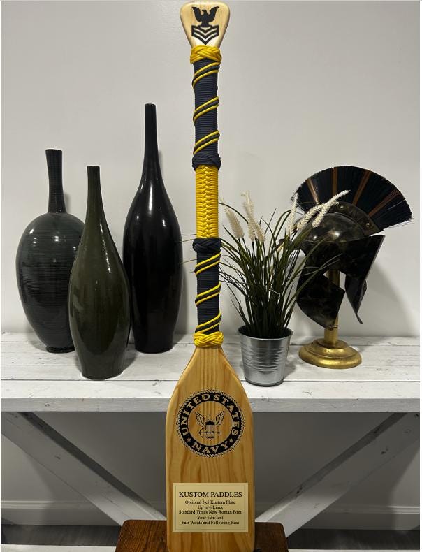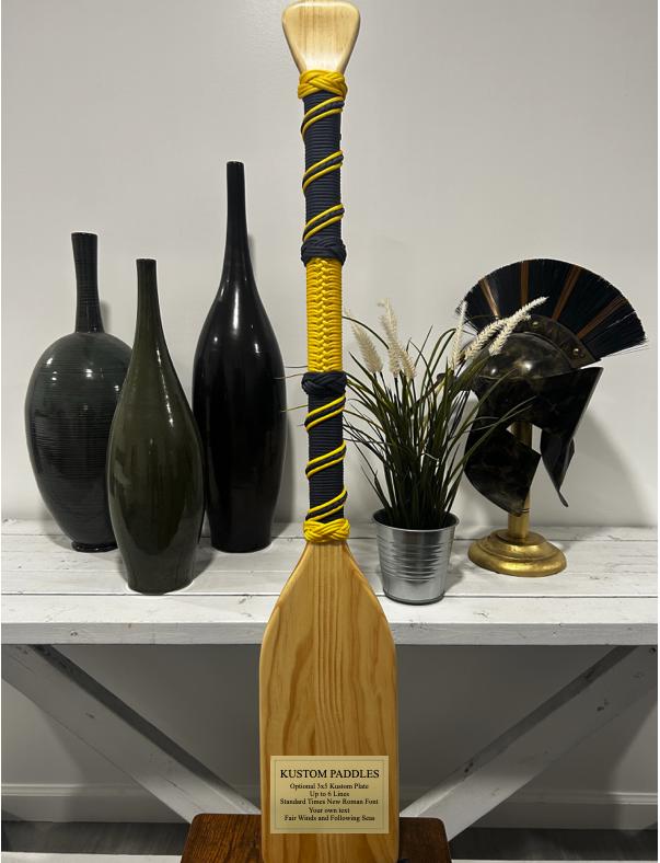 Navy Blue and Yellow wrapped paracord over 36" paddle. A perfect gift for any occasion to express one for their significant accomplishments, graduation, promotion, retirement, remembrance, holiday gift, or simply just saying thanks. Or treat yourself one to show your pride. Idea for self mounting ribbon, medal, coin, or badge with your own style of decoration. These are made to order and every paddle is carefully hand wrapped with loop hangers on the back for optional wall hanging display. Optional 3"x5" plastic engraved PLATE with your own inscription in standard Times New Roman font, up to 6 lines. Send your creative ideas and files to Kustompaddles [!at] gmail.com for laser engraving option for both the top handle and center blade. Optional Paddle bag to help conceal and reveal to recipients also available.